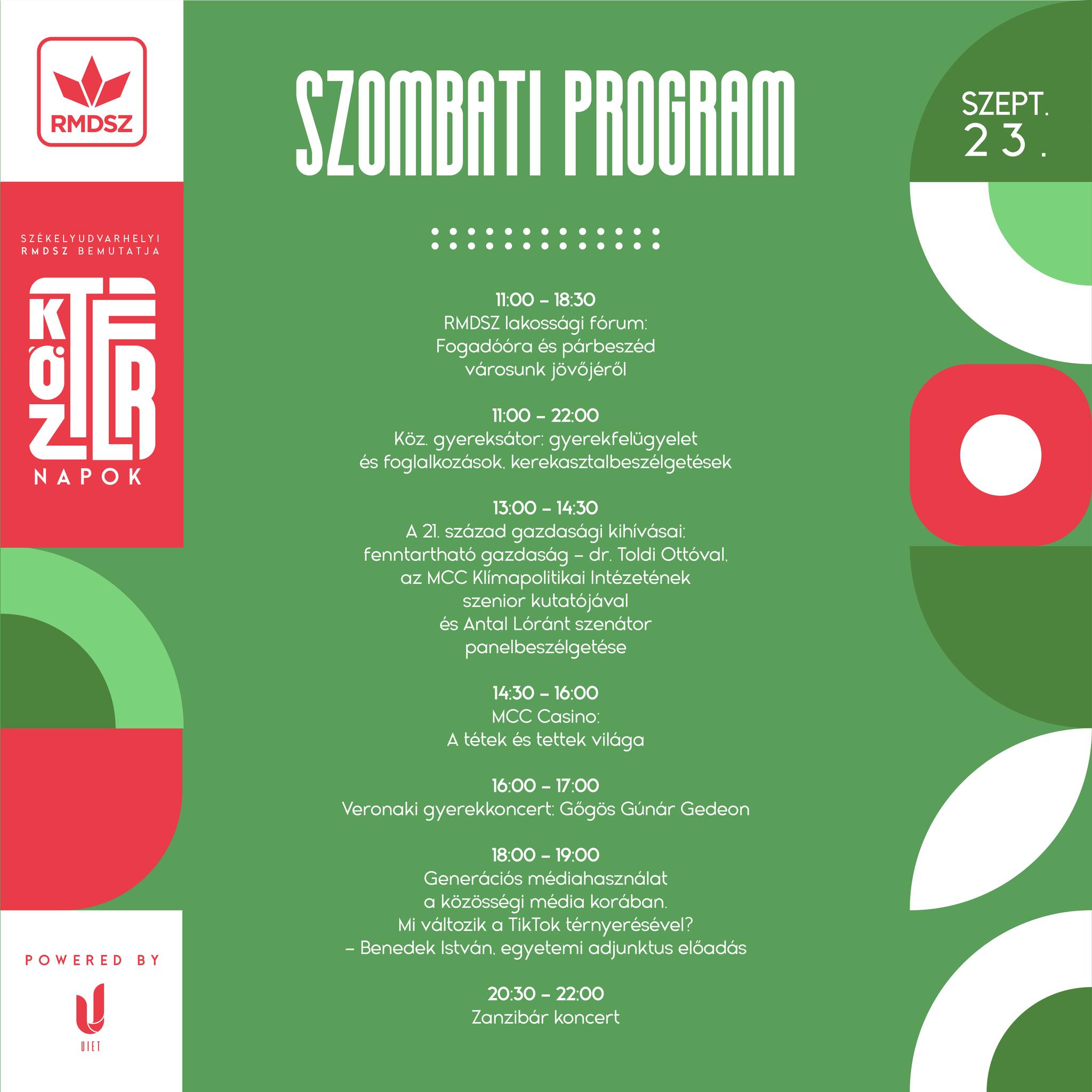 Kétnapos rendezvénnyel ünnepli a Székelyudvarhelyi RMDSZ a KözTér iroda egyéves születésnapját. A szeptember 22‒23-i eseményen tartalmas előadásokkal, lakossági fórummal, gyermekprogramokkal, koncertekkel és interaktív foglalkozásokkal várnak minden érdeklődőt. A rendezvényen lesznek kerekasztal-beszélgetések és vércukor- meg vérnyomásmérés is. Az esték hangulatáról Tamás Gábor, a Jakab Csaba & Band és Takács Nikolas, valamint a Zanzibár gondoskodik.