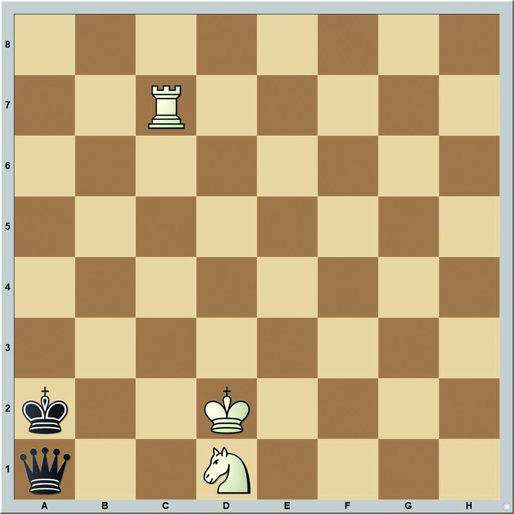 Bernhard Horwitz 1882-es tanulmányában világos nyer: 1.Ba7+ Kb1 2.Bb7+ Ka2 3.Kc2!! Vd4 4.Hc3+ Ka3 (4…Ka1 5.Bb1 arab matt) 5.Bb3 matt (1-0).