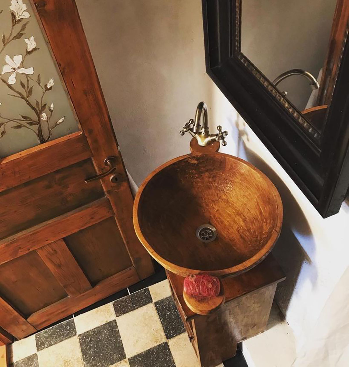 „A lenti mosdó burkolata szintén eredeti cementlap, le volt betonozva, amikor feltörtük, akkor láttam meg alatta a cementlapokat, a tíz körmömmel vájtam ki a betonból. A kagylóként szolgáló fatálat egy kedden vettem a piacon, a lefolyónak vágtunk egy lyukat, impregnáltam, hogy legyen vízálló” – mutatja az alsó szint ékét tovább. „Nálam a kötődést egy épület iránt a saját két kezem munkája alakítja ki, ha én magam csiszoltam az ablaktokot vagy az ajtót, én pácoltam vagy én festettem, attól érzem igazán magaménak – vallja kötődéséről házigazdánk. „Igyekeztem, hogy minden évben valamit tudjak felújítani, egy szobát, egy fürdőszobát még, vagy valamit haladni apránként. Teljesen más így a kötődés is, ha nem egy generálkivitelező jön, és csinál meg mindent” – teszi hozzá.